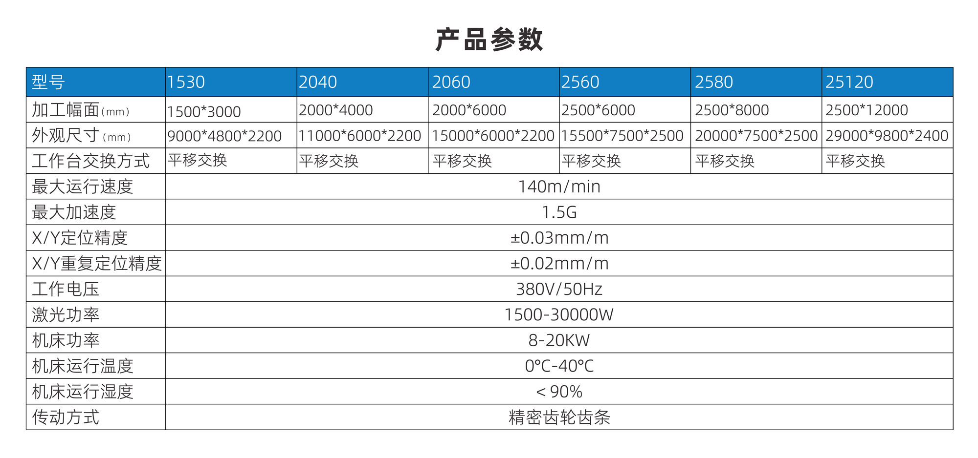| 加工幅面(mm) | 1500*3000 | 2000*4000 | 2000*6000 | 2500*6000 | 2500*8000 | 2500*12000 |