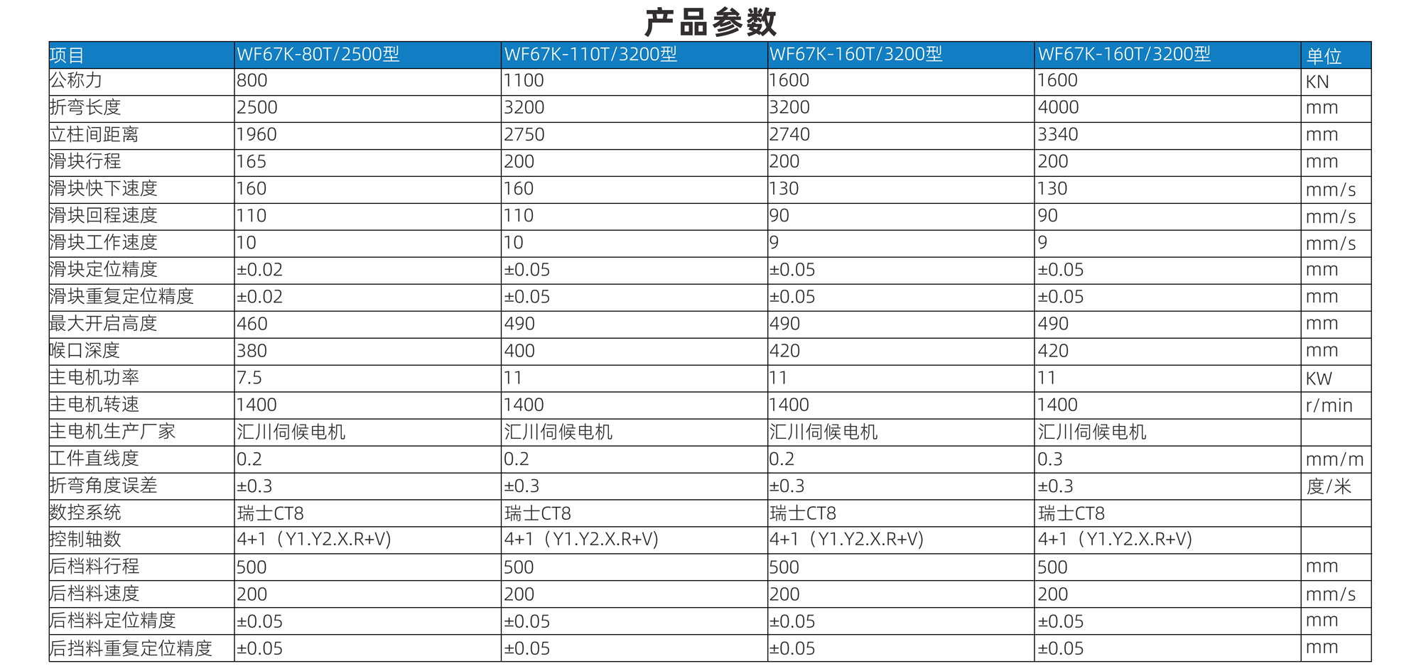 | 型號 | WF67K-80T/2500型 | WF67K-110T/3200型 | WF67K-160T/3200型 | WF67K-160T/3200型 | 單位 |